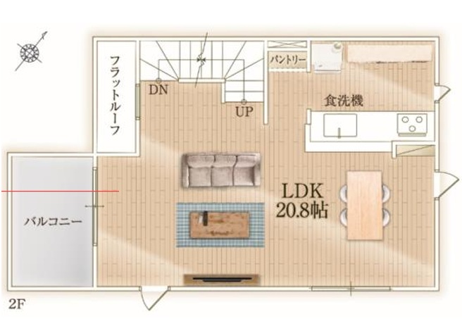 | 設備・条件 | 平坦地/南道路/トイレ2か所/駐車場あり/ビルトインガレージ/リビングダイニング15畳以上/リビングに階段あり/対面キッチン/食器洗い乾燥機/パントリー/浴室乾燥機あり/バス・トイレ別/洗濯機置き場/独立洗面台/バルコニー/シューズインクローゼット/フラット35利用可/ | ||
