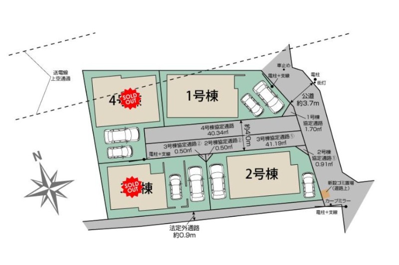 | 備考・特記事項 | 協定道路(敷地面積に含む)2号棟1.41㎡。協定部分については地役権設定登記を行います。費用:買主負担。電柱・支線が敷設されています。36.81㎡送電線下につき地役権が設定されています。TVアンテナ(電波障害等によるケーブルTV、共聴アンテナ)の申込はお客様負担です。図面と現況に相違がある場合、現況優先とします。司法書士、土地家屋調査士は売主指定です。網戸は東栄ホームサービスへの発注となります。なお、表示価格は建物引渡20日前迄の申込が条件となります。 | ||